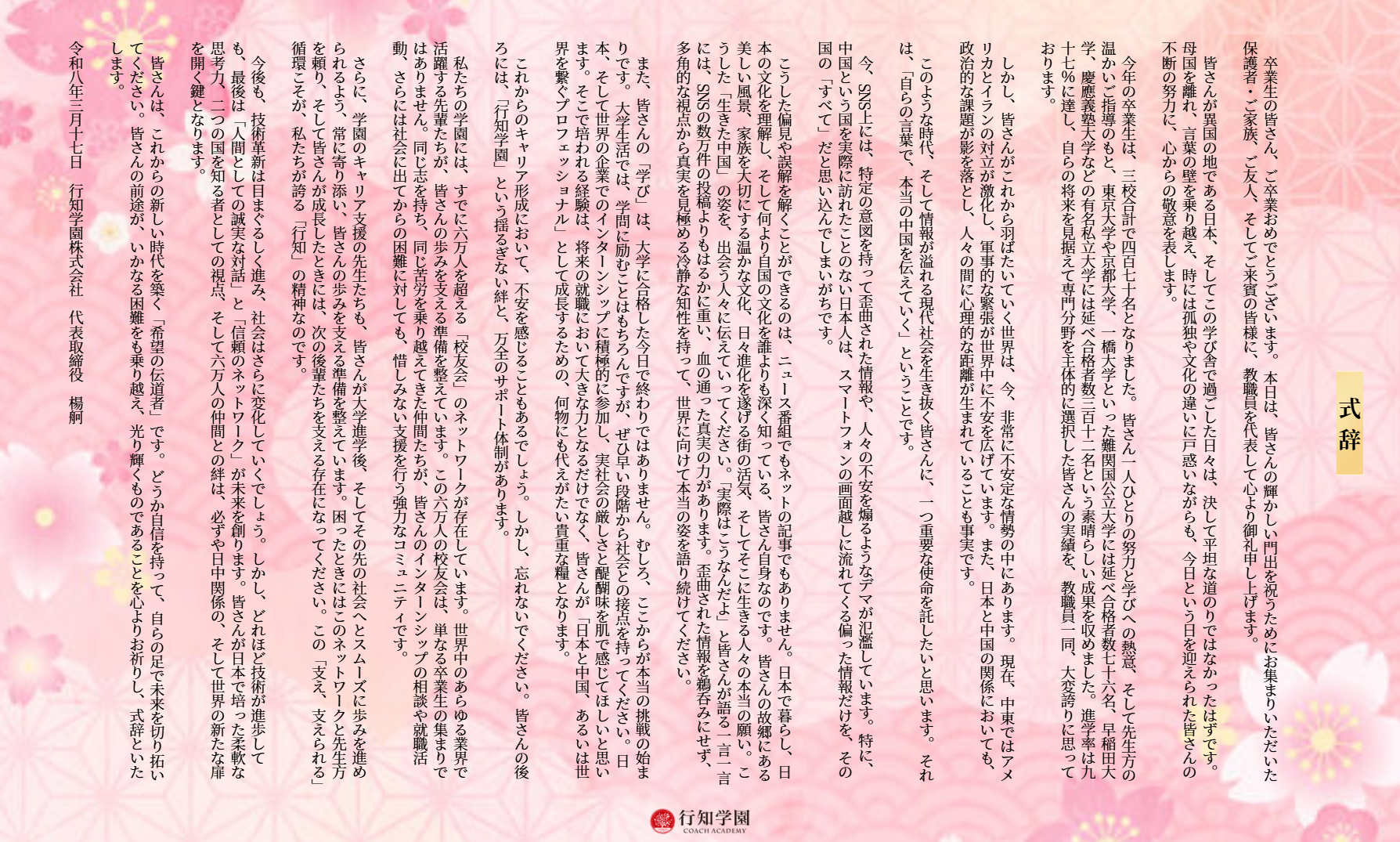 令和八年三月十七日 行知学園株式会社 代表取締役 楊舸