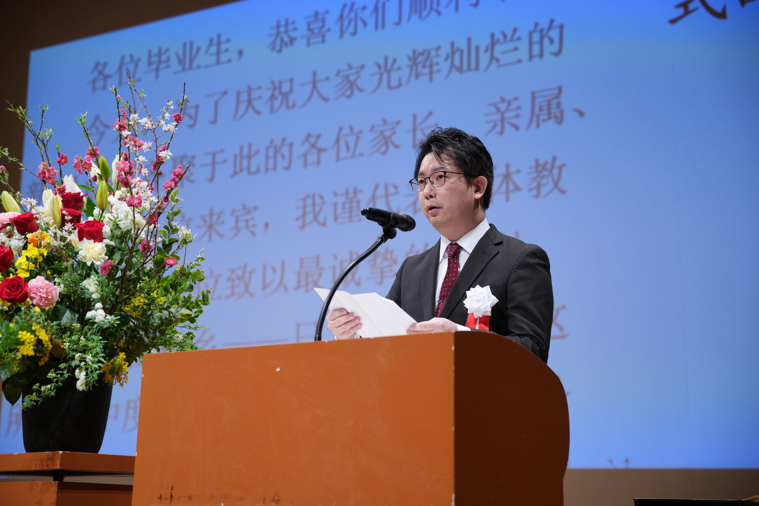 各位毕业生,恭喜你们顺利毕业。今天,为了庆祝大家光辉灿烂的新起点而齐聚于此的各位家长、亲属、朋友以及各位来宾,我谨代表全体教职员工,向各位致以最诚挚的感谢。大家在异国他乡——日本,以及在这所学府中度过的岁月,想必绝非一条平坦的道路。离开祖国,跨越语言的障碍,有时在孤独中坚持,也曾因文化差异而感到困惑,但大家依然一步一步走到了今天。对于你们坚持不懈的努力,我由衷地表示敬意。